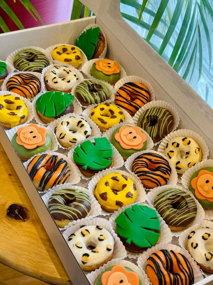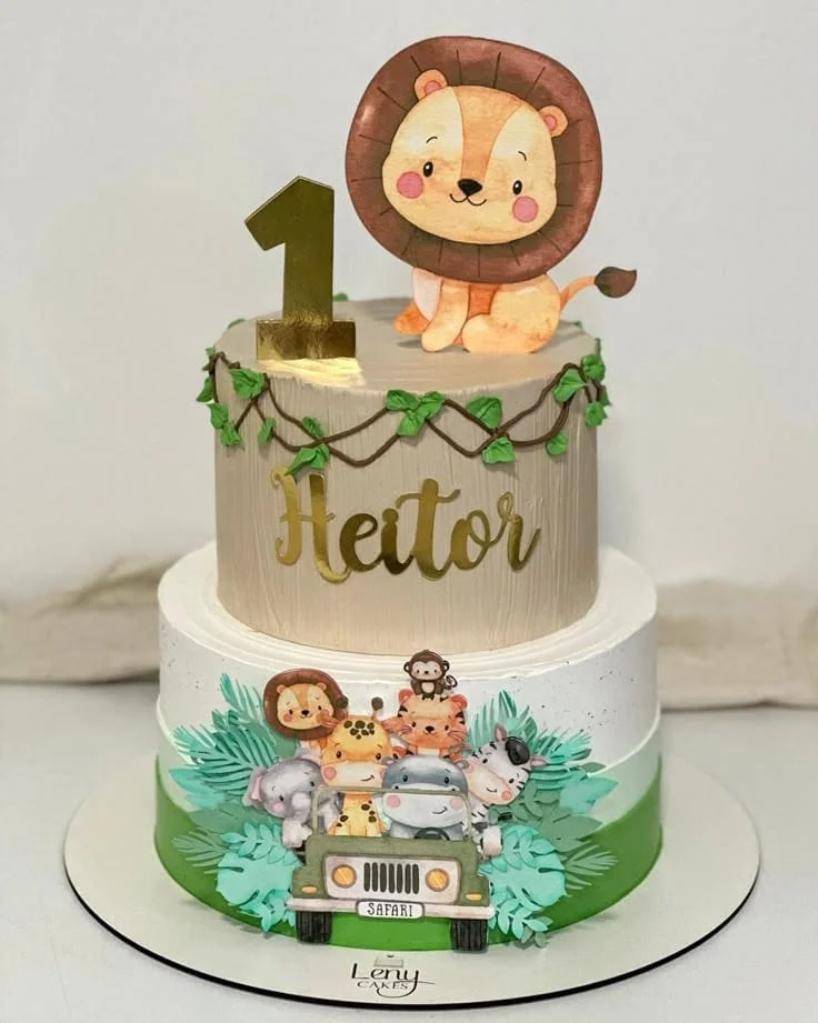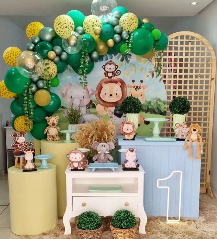Uma festa cheia de aventuras com zebras, girafas, elefantes e muitas folhagens! O verde e os tons terrosos dominam essa decoração, criando um clima selvagem e divertido.