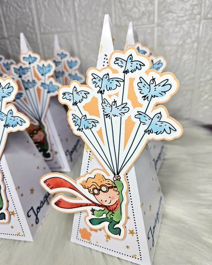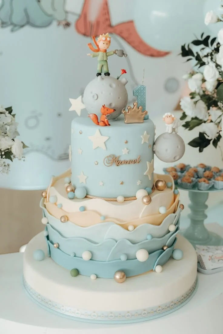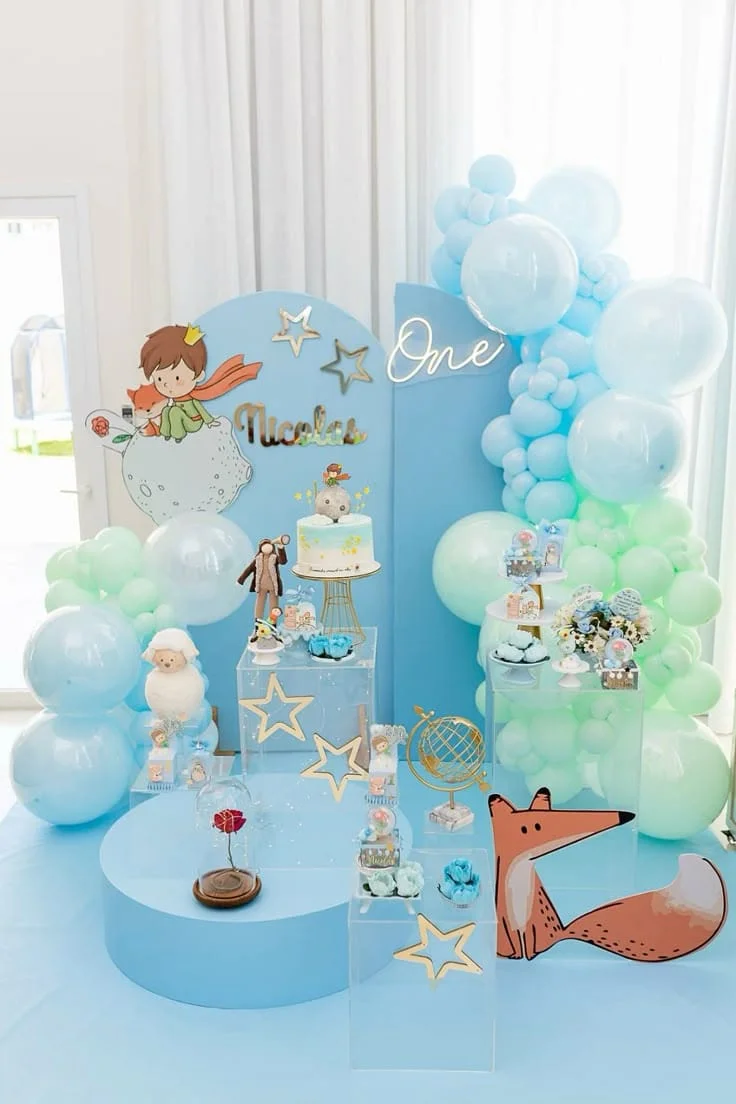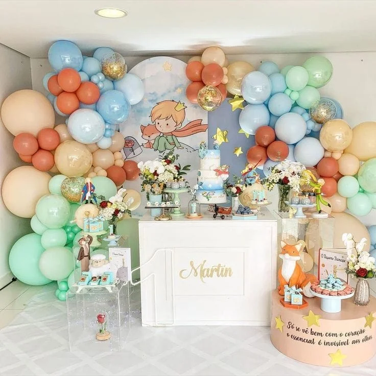 Inspirado no famoso livro, esse tema traz tons suaves de azul e dourado, além de elementos como estrelas, planetas e o icônico príncipe com sua rosa.
