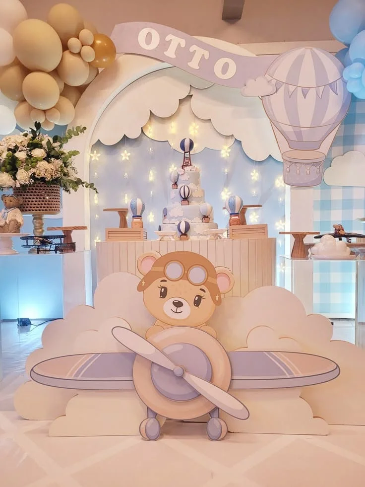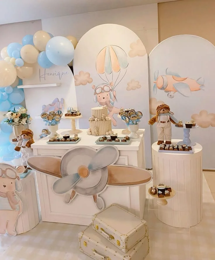 Com um toque aventureiro e delicado, esse tema traz elementos como balões, nuvens e aviõezinhos, criando uma atmosfera encantadora para celebrar o primeiro ano do seu pequeno piloto.