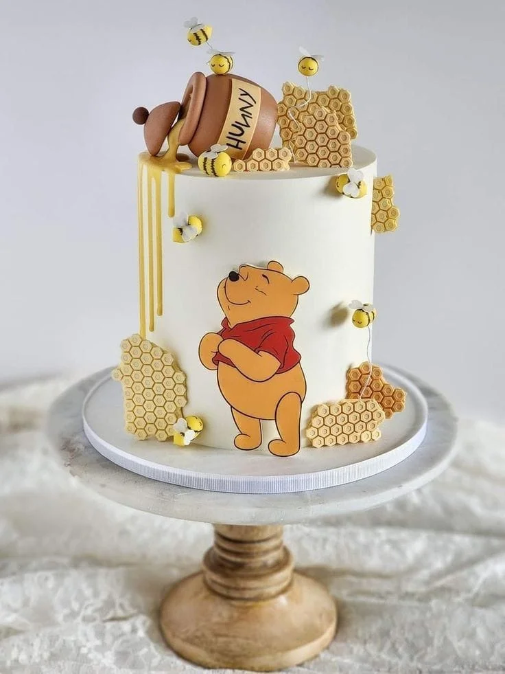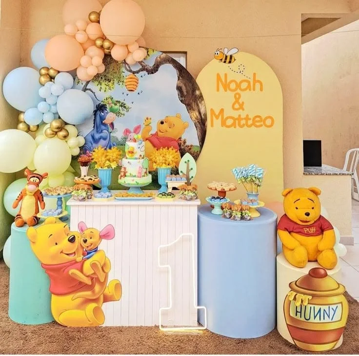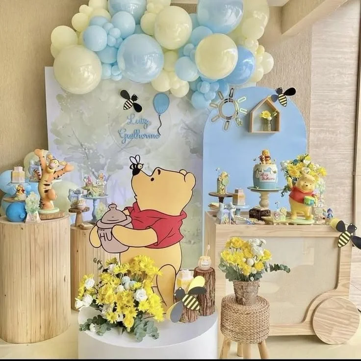 Com muito mel e personagens fofos do Bosque dos Cem Acres, essa decoração traz um toque nostálgico e encantador para a festa.
