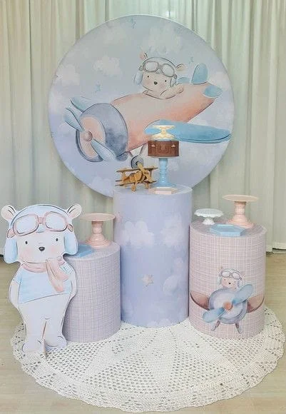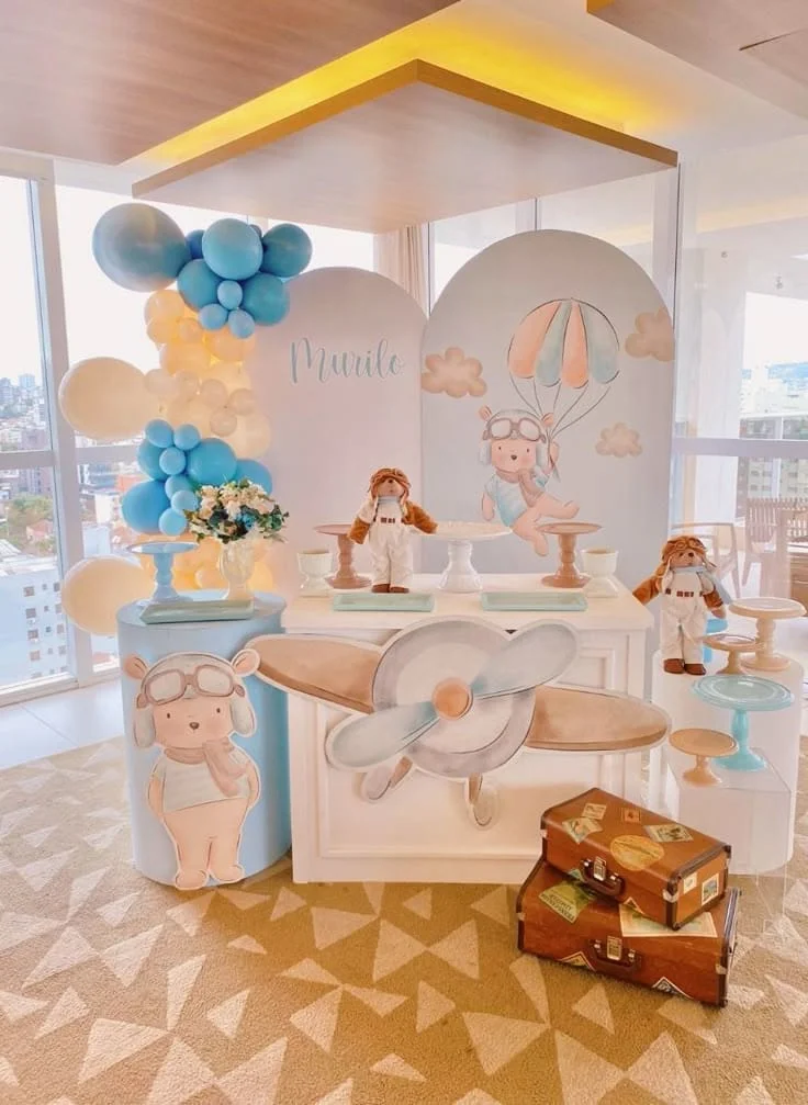 É uma opção encantadora para celebrar a chegada do pequeno aventureiro! Com tons de azul, bege e branco, a decoração pode incluir nuvens, balões e ursinhos pilotando aviões. Esse tema transmite a ideia de sonhos e novas jornadas, tornando o evento ainda mais especial e cheio de emoção!