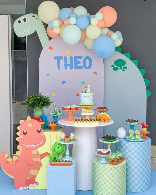É uma opção divertida e cheia de encanto para celebrar a chegada do pequeno. Com uma paleta em tons de verde, laranja e azul, a decoração pode contar com dinossauros fofinhos e folhas tropicais. Esse tema traz um toque de aventura e imaginação, tornando a festa ainda mais especial e inesquecível!