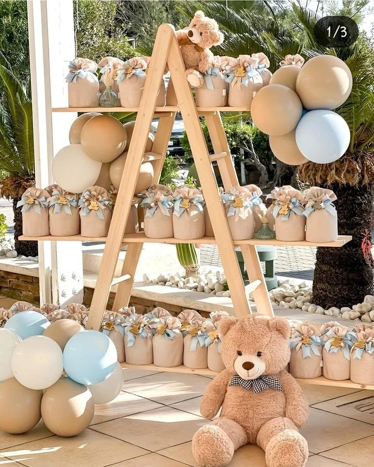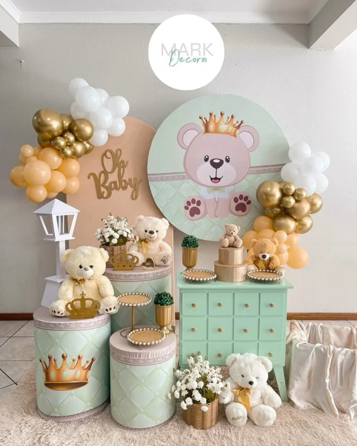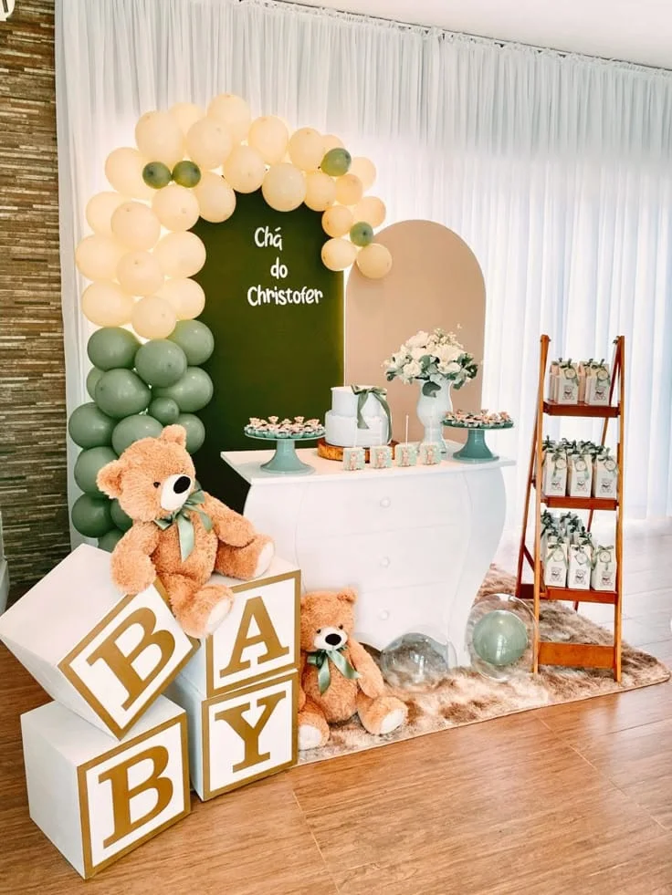 É um tema clássico e cheio de fofura para comemorar a chegada do bebê. Com cores suaves como azul, verde, bege e tons pastéis, a decoração pode incluir pelúcias, laços e detalhes delicados. Ursinhos espalhados pelo ambiente deixam tudo mais aconchegante, criando um clima de carinho e doçura para esse momento tão especial!