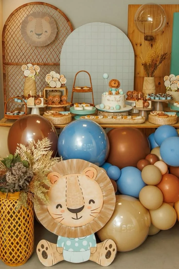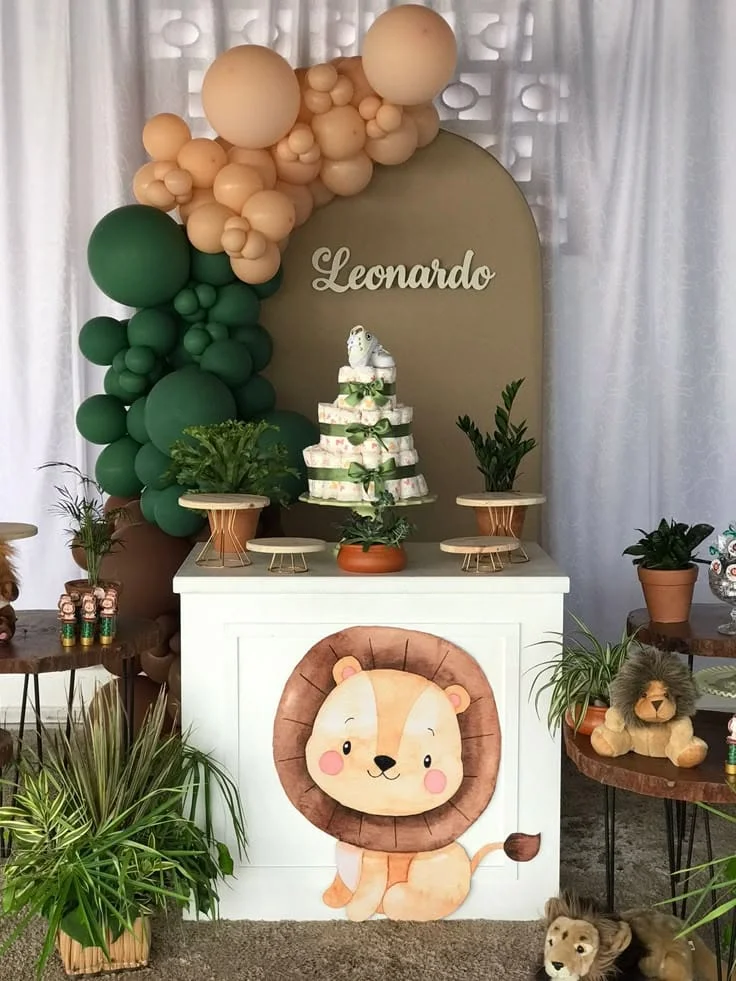 É uma escolha fofa e cheia de personalidade para celebrar a chegada do bebê. Com uma paleta em tons de laranja, bege e verde, a decoração pode incluir folhagens e leõezinhos espalhados pelo ambiente. Esse tema simboliza força, coragem e proteção, tornando a festa ainda mais especial e inesquecível!