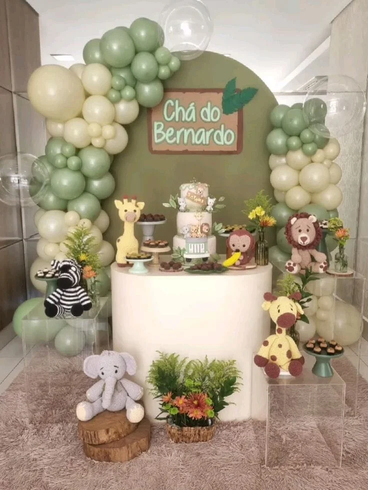 É perfeito para quem deseja uma festa cheia de aventura e fofura! Com uma paleta em tons de verde, bege e marrom, a decoração pode incluir animais como leões, girafas, elefantes e macacos, além de folhagens tropicais. Esse tema traz um toque divertido e encantador, criando um ambiente alegre e inesquecível para celebrar a chegada do bebê!