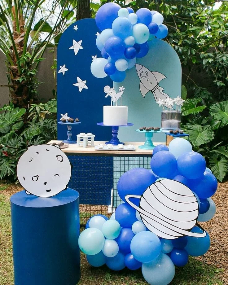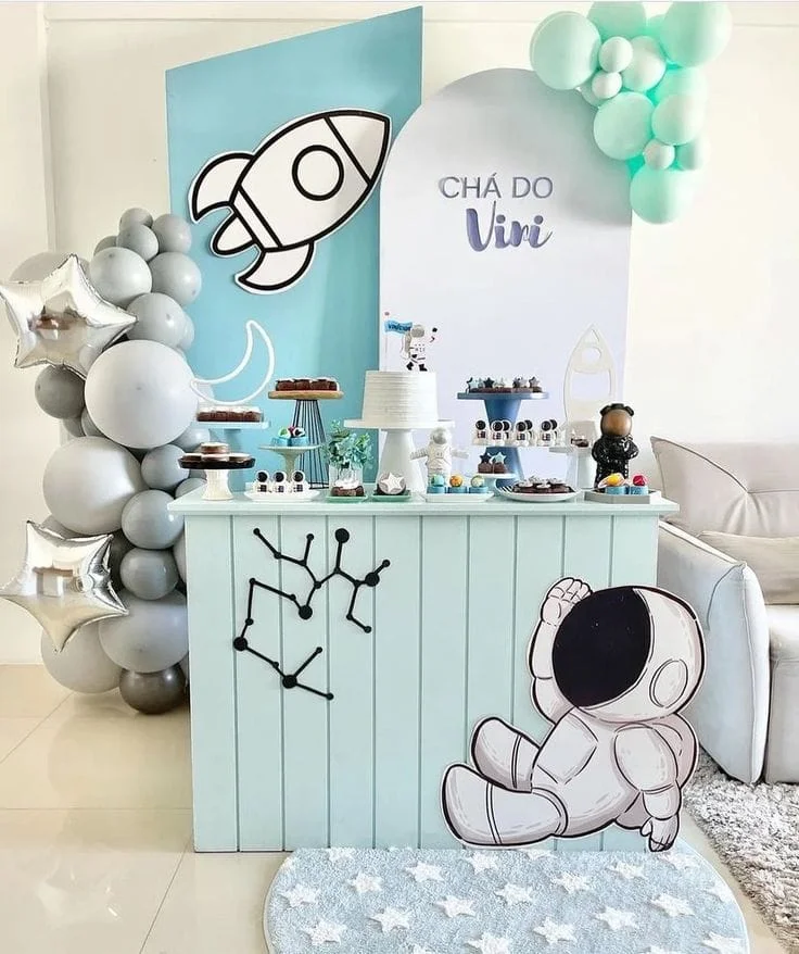 É perfeito para uma celebração cheia de magia e aventura! Com uma paleta em tons de azul, verde e prata, a decoração pode incluir planetas, estrelas e foguetes prontos para decolar. Esse tema simboliza novos começos e grandes sonhos, tornando a chegada do bebê ainda mais especial e inesquecível!