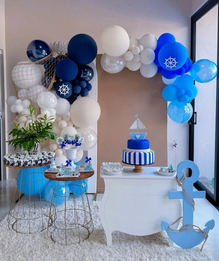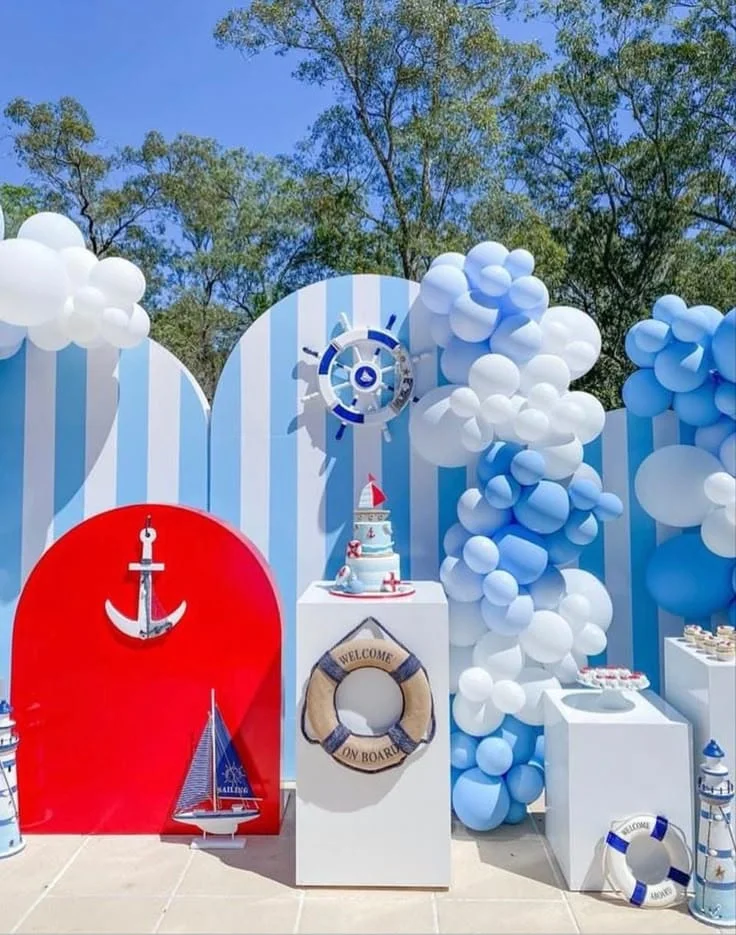 É um tema clássico e encantador para celebrar a chegada do pequeno. Com uma paleta de azul, branco e vermelho, a decoração pode incluir âncoras, boias e barquinhos, criando um clima náutico cheio de charme. Esse tema transmite aventura e serenidade, tornando a festa especial e memorável para todos!
