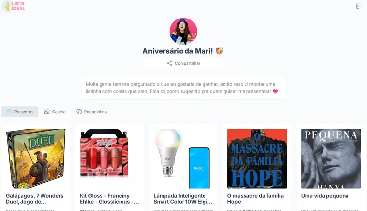 Quando você cria uma lista de aniversário no Lista Ideal, pode: