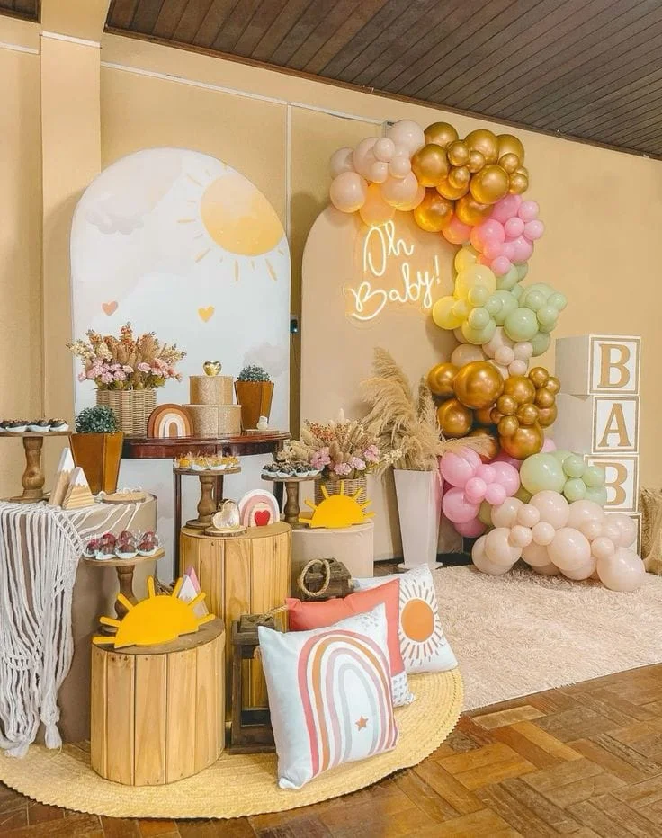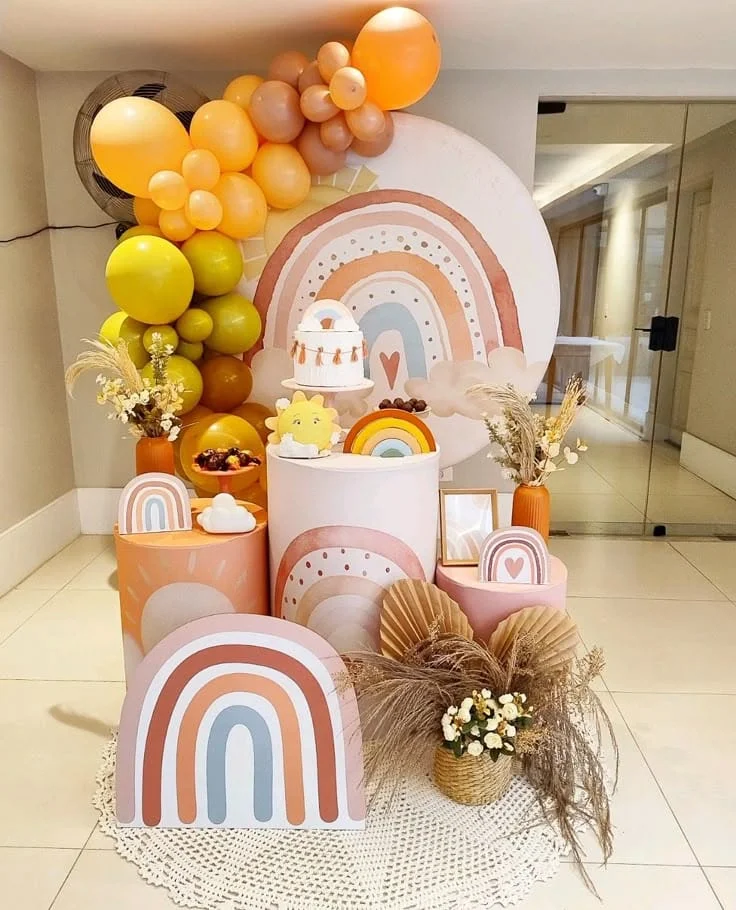 É perfeito para uma celebração cheia de cor, alegria e significado. Representando esperança e renovação, esse tema combina tons vibrantes ou pastéis em balões, painéis e docinhos temáticos. Nuvens fofas, estrelinhas e elementos brilhantes complementam a decoração, criando um ambiente mágico e encantador para receber o bebê com muito amor!