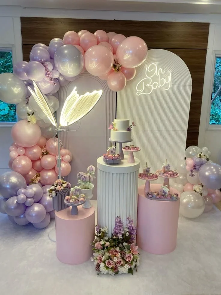 Traz leveza e delicadeza para a celebração, simbolizando transformação e um novo começo com a chegada do bebê. A decoração pode contar com tons suaves de lilás, rosa e verde, além de borboletas em painéis, docinhos e enfeites. Flores, laços e detalhes brilhantes complementam o clima mágico, criando um ambiente encantador e inesquecível para esse momento especial!
