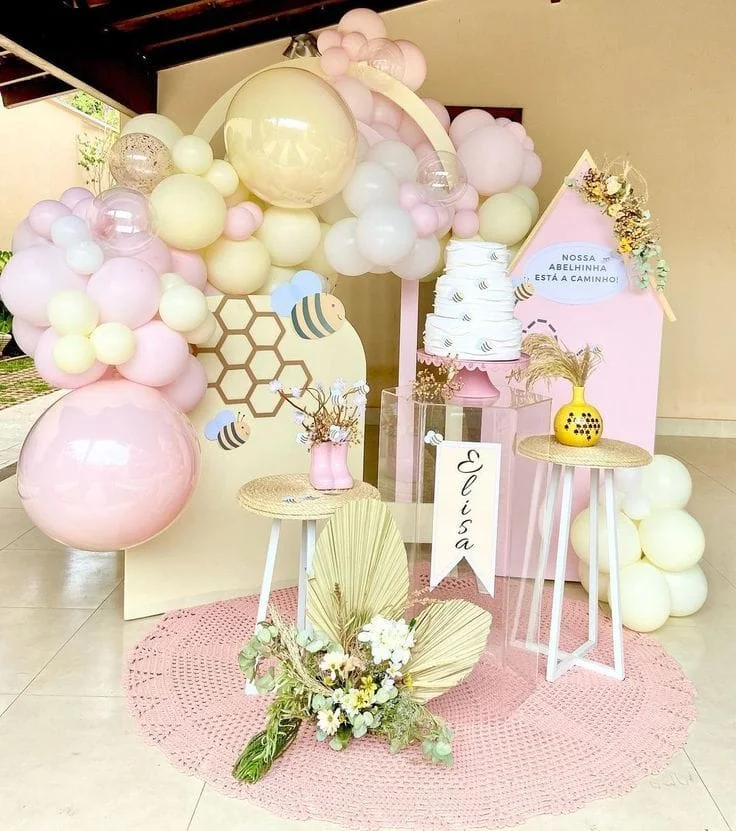 É uma opção doce e cheia de charme para comemorar a chegada do bebê. Com uma paleta vibrante de amarelo e rosa, a decoração pode incluir colmeias, flores e abelhinhas espalhadas pelos enfeites e docinhos. Esse tema simboliza doçura e alegria, criando um ambiente acolhedor e encantador para celebrar esse momento especial com amigos e familiares!