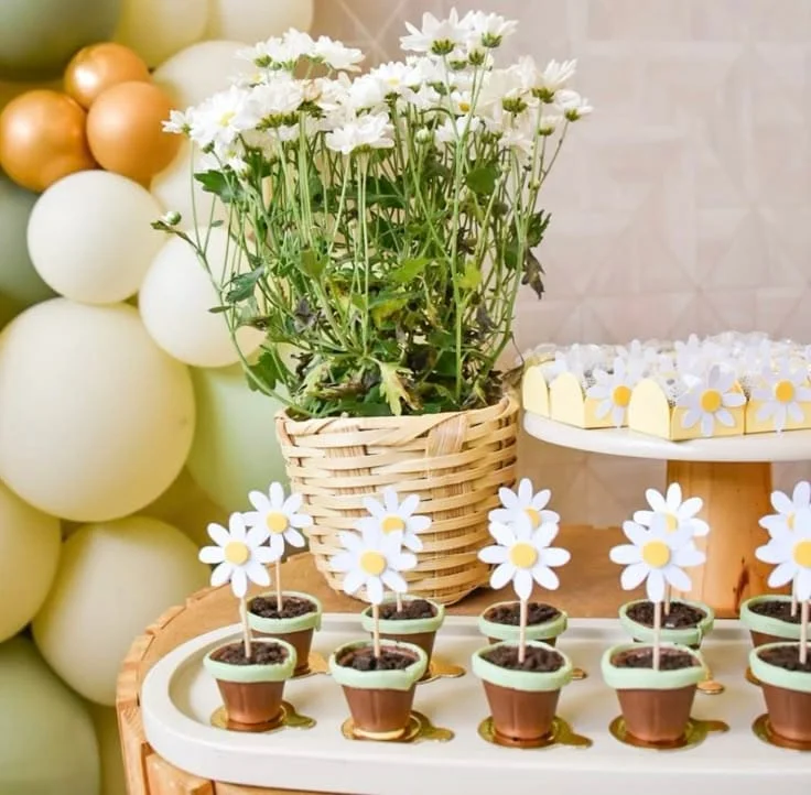 Traz um toque delicado e cheio de frescor para a celebração. Com uma paleta em tons de amarelo, rosa e branco, a decoração pode incluir flores naturais, arranjos leves e detalhes campestres. As margaridas simbolizam pureza e alegria, tornando o ambiente acolhedor e perfeito para receber o bebê com muito carinho!