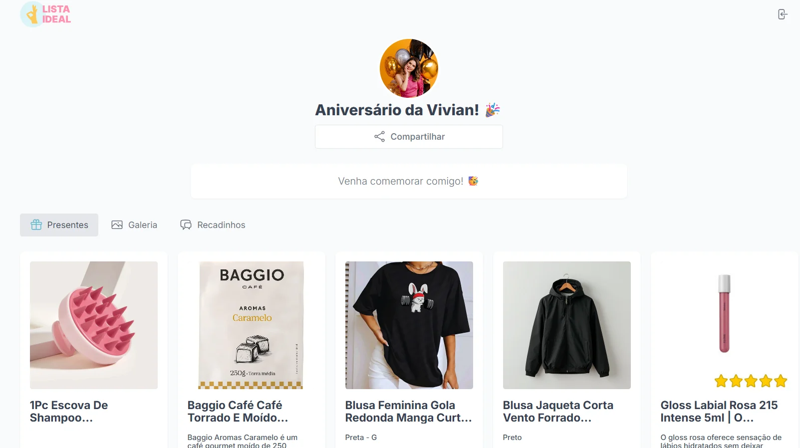 🎉 Pronto! Agora é só montar sua lista com os itens que desejar e, quando quiser, compartilhar com seus convidados.