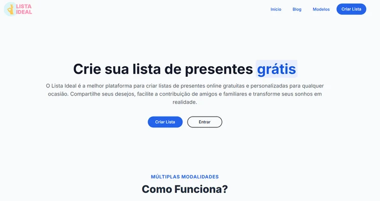 O Lista Ideal é uma plataforma 100% gratuita onde você pode criar listas de presentes personalizadas para qualquer tipo de ocasião. Com ela, você organiza tudo em um só lugar, escolhe os presentes que deseja ganhar e compartilha com seus convidados de forma fácil.