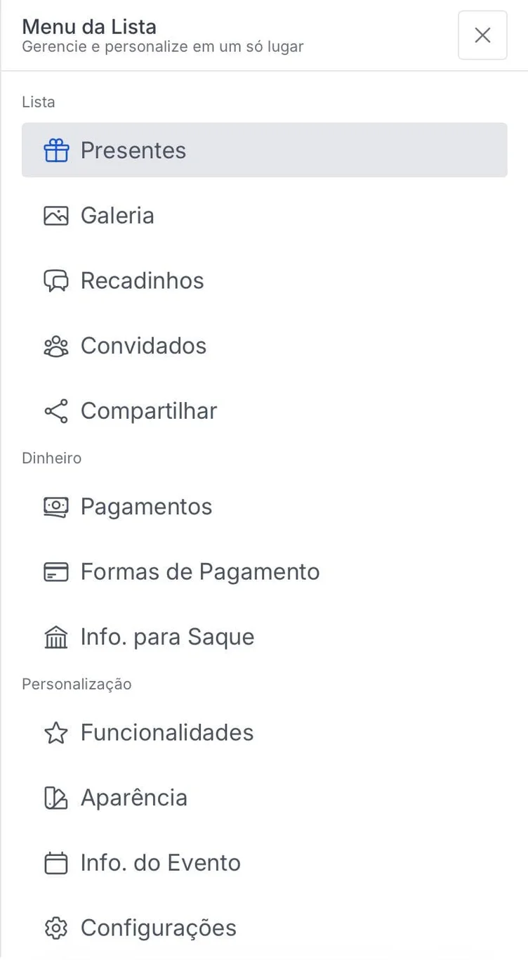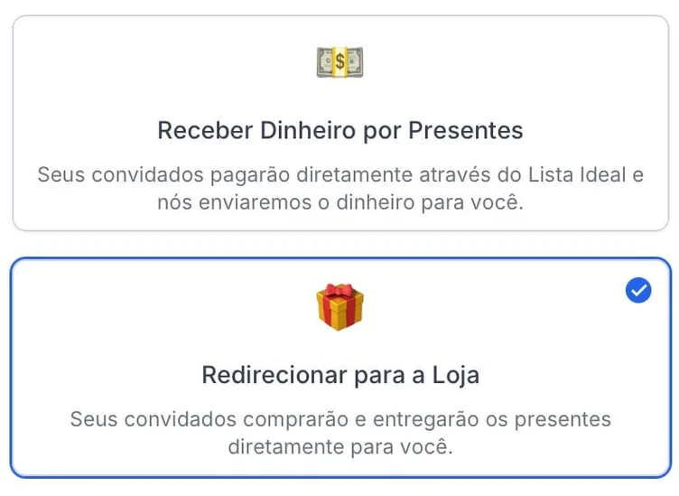 No Lista Ideal, você decide como prefere receber seus presentes. Existem duas opções: